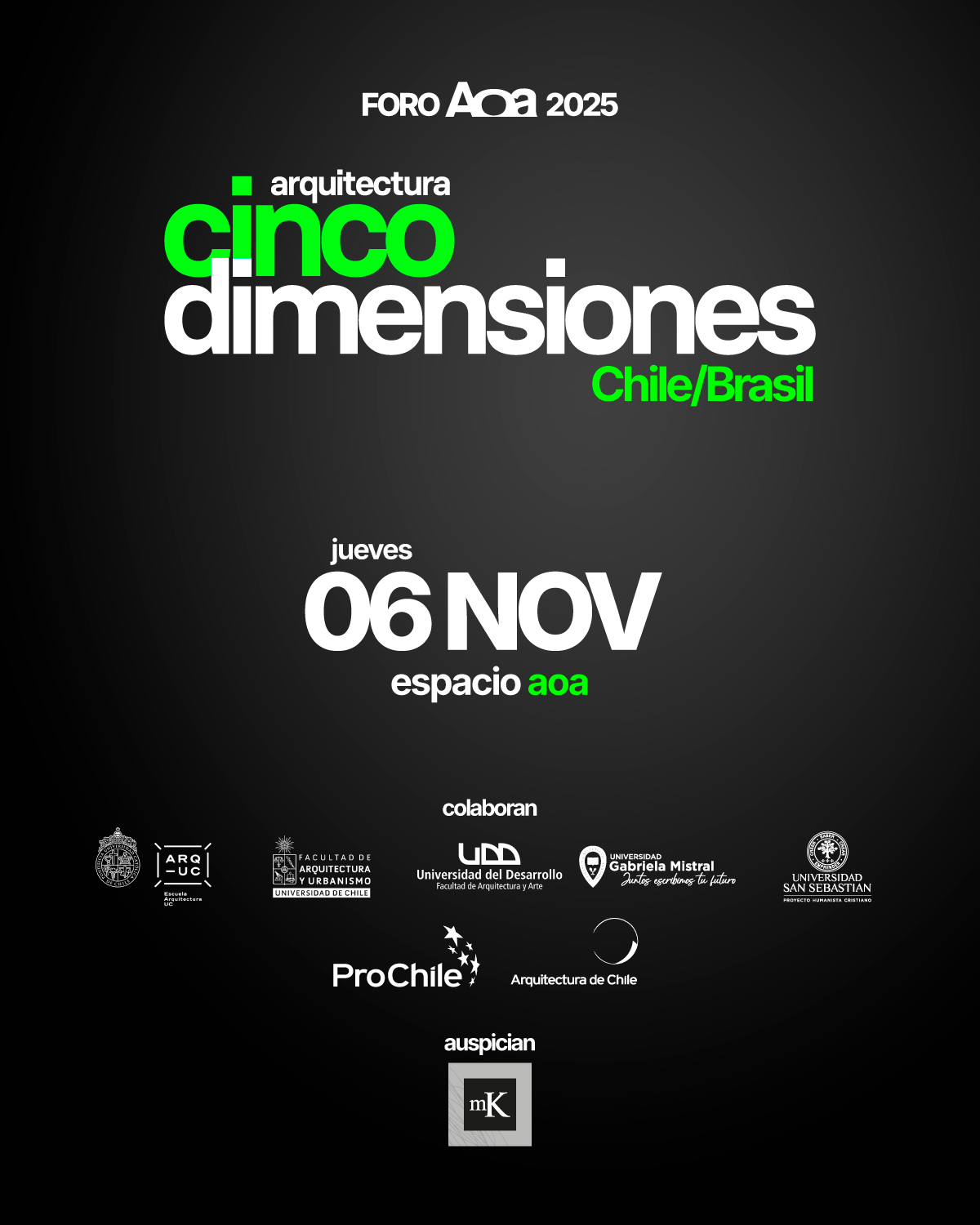 Santiago, octubre de 2025.– La Asociación de Oficinas de Arquitectos de Chile (AOA) anunció la realización del Foro AOA 2025: “Chile-Brasil  Arquitectura en 5 Dimensiones. Nuevas formas de habitar las ciudades latinoamericanas”, que se llevará a cabo el 6 de noviembre en el Espacio AOA.