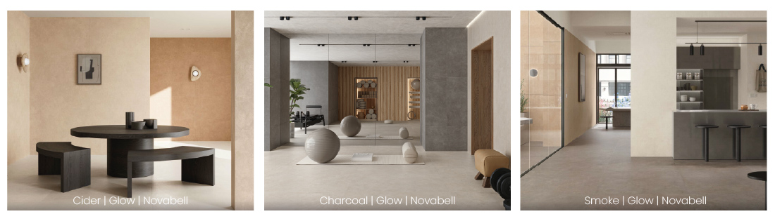 Dentro de esta línea, la colección GLOW de NovaBell, disponible en ATIKA, ofrece una interpretación perfectamente lograda del cemento pigmentado. Sus colores —inspirados en gamas naturales— aportan calidez y carácter sin perder la esencia minimalista del cemento. Además, la colección no se limita a un solo acabado: incluye tanto piezas de diseño liso como otras con decorados y texturas, lo que permite alternar superficies sobrias con zonas más elaboradas sin romper la unidad cromática. Los decorados —con detalles gráficos sutiles y texturas que responden a la luz— refuerzan la materialidad realista del cemento pigmentado, generando superficies auténticas que funcionan con gran naturalidad en proyectos donde se busca equilibrio entre neutralidad y expresión cromática.