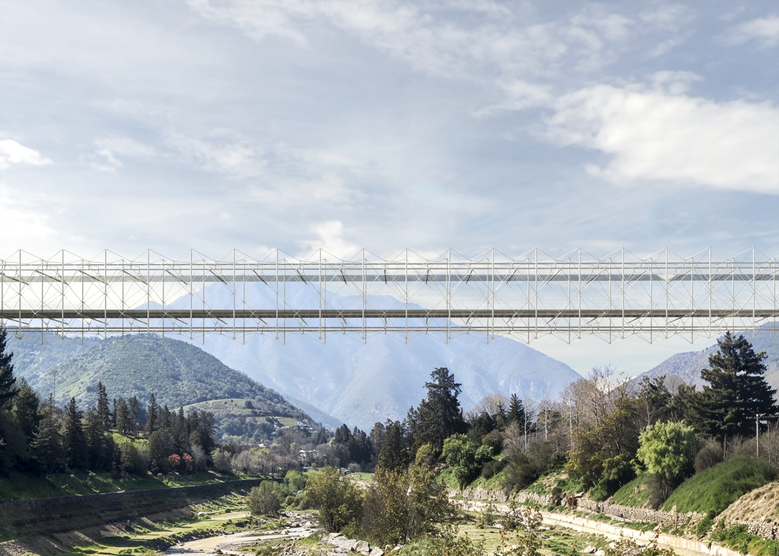 Su propuesta destacó por una expresividad estructural excepcional, basada en principios de tensegridad y equilibrio isostático, lo que permite dar forma a una pasarela liviana, armónica y visualmente memorable. El jurado valoró especialmente cómo esta estructura dialoga con la contundente geografía de los cerros del sector.