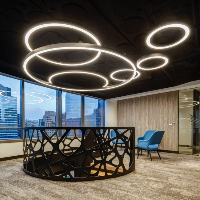 La expansión de los Andes domina las vistas y está presente en los espacios de recepción y work lounge de la oficina. El parque metropolitano en las áreas de reuniones y las vistas a la ciudad en las áreas de trabajo.