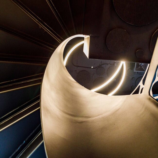 Veremos en el diseño, la Cordillera de los Andes en forma y anochecer, el Parque Metropolitano, el rio, la ciudad, los mensajes de silencio, el buzo, y la mantarraya en forma de lampara sobre la escalera de caracol (Fibonacci) con su baranda de inspirada en la “Morchella” un hongo Patagónicoque la teje mientras se desarrolla.