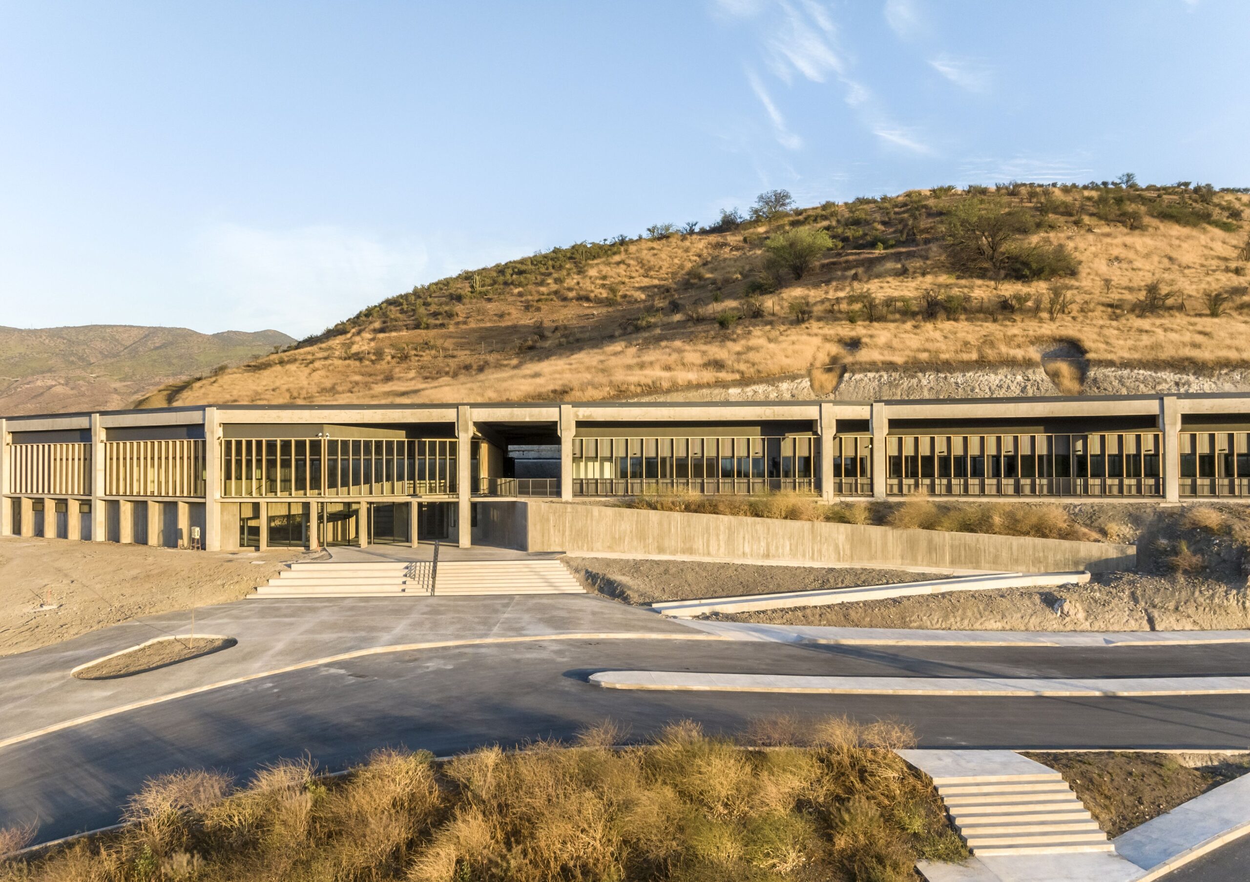 Por un lado, el colegio se localizó en el faldeo del cerro Las Rodríguez en Chicureo, lo que significó un estudio de las condiciones topográficas, asoleamiento y vientos, junto a la flora y fauna local, de manera de consolidar una propuesta que se integre a su entorno, capitalizando las vistas y oportunidades de su emplazamiento. Para esto se definió la cota 583,35 como el nivel educacional, donde se despliegan todos los módulos de aprendizaje bajo una arquitectura que reinterpreta la cota, abriendo las vistas del valle de manera secuencial desde la pre básica hasta la media. La lógica de consolidar todo el edificio en la misma cota, también permiten una fluidez en el desplazamiento y la flexibilidad espacial de los recintos de aprendizaje. Luego los patios y canchas deportivas se descuelgan en terrazas sucesivas conectadas entre sí mediante el paisajismo y planos inclinados que se abalconan a la quebrada el loro y al valle de Chicureo.