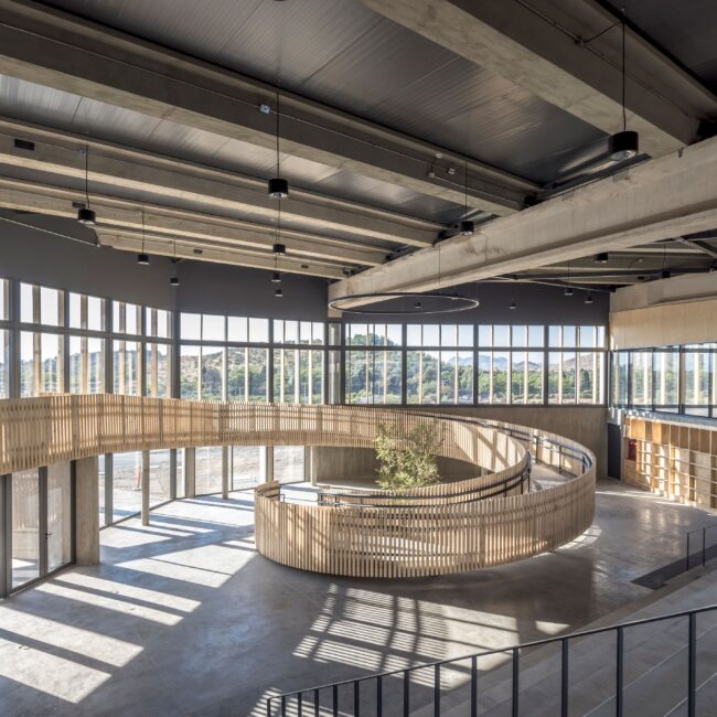 La arquitectura a escala geográfica propuesta se complementa con un trabajo de alturas, recintos y materialidades que busca generar una habitabilidad apropiada para incentivar el aprendizaje. Por un lado, la presencia de la madera como revestimiento, permite entregar espacios calmos en los cuales los estudiantes pueden lograr mejores niveles de concentración, junto con el manejo de las diferentes alturas e iluminación de los interiores, dotando de diversidad espacial para responder a los distintos requerimientos colectivos e individuales de los alumnos.