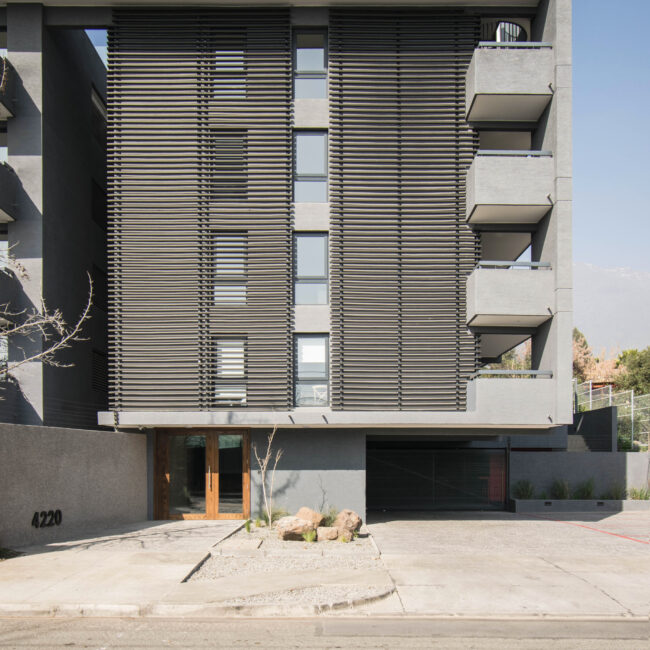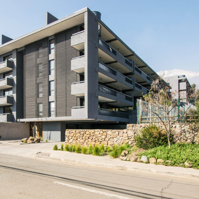 El edificio JDVC está emplazado en un terreno de 40 mt de frente x 100 mts de fondo, con una pendiente de 8 % aproximadamente, en un barrio que ha experimentado una transformación de parcelas con casas aisladas y mucho terreno libre a edificios de baja altura o condominios de casas pareadas.