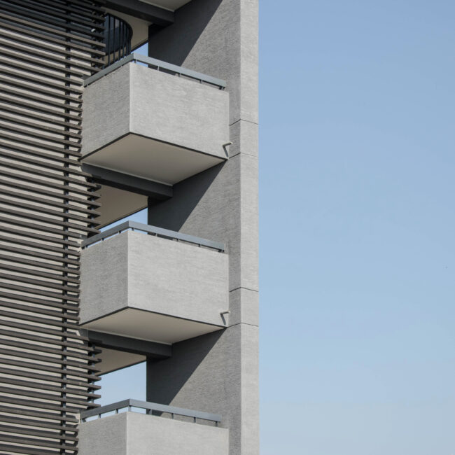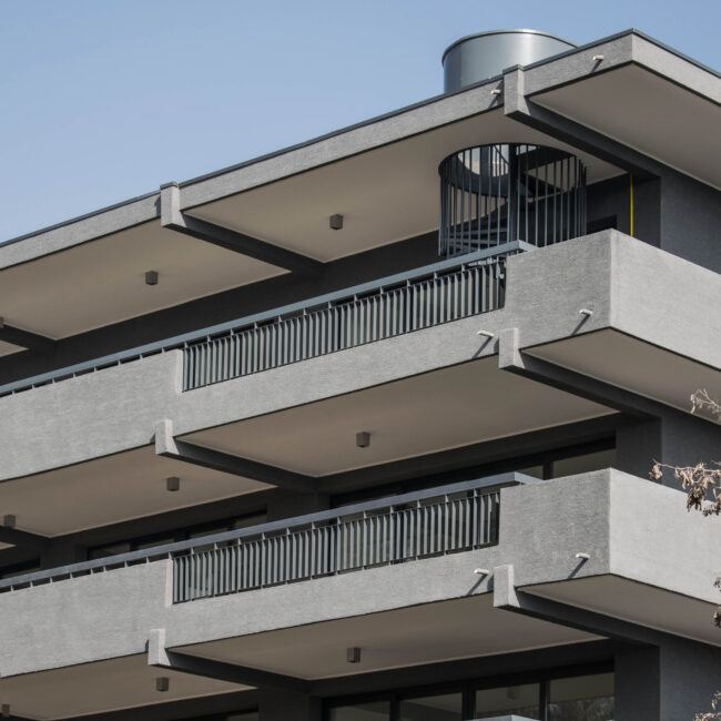 La búsqueda de amplitud también se dio en las fachadas donde se determinó jugar con la altura de los antepechos y barandas para permitir que las zonas públicas de los departamentos tuvieran la mayor luz posible, y los dormitorios mayor privacidad.