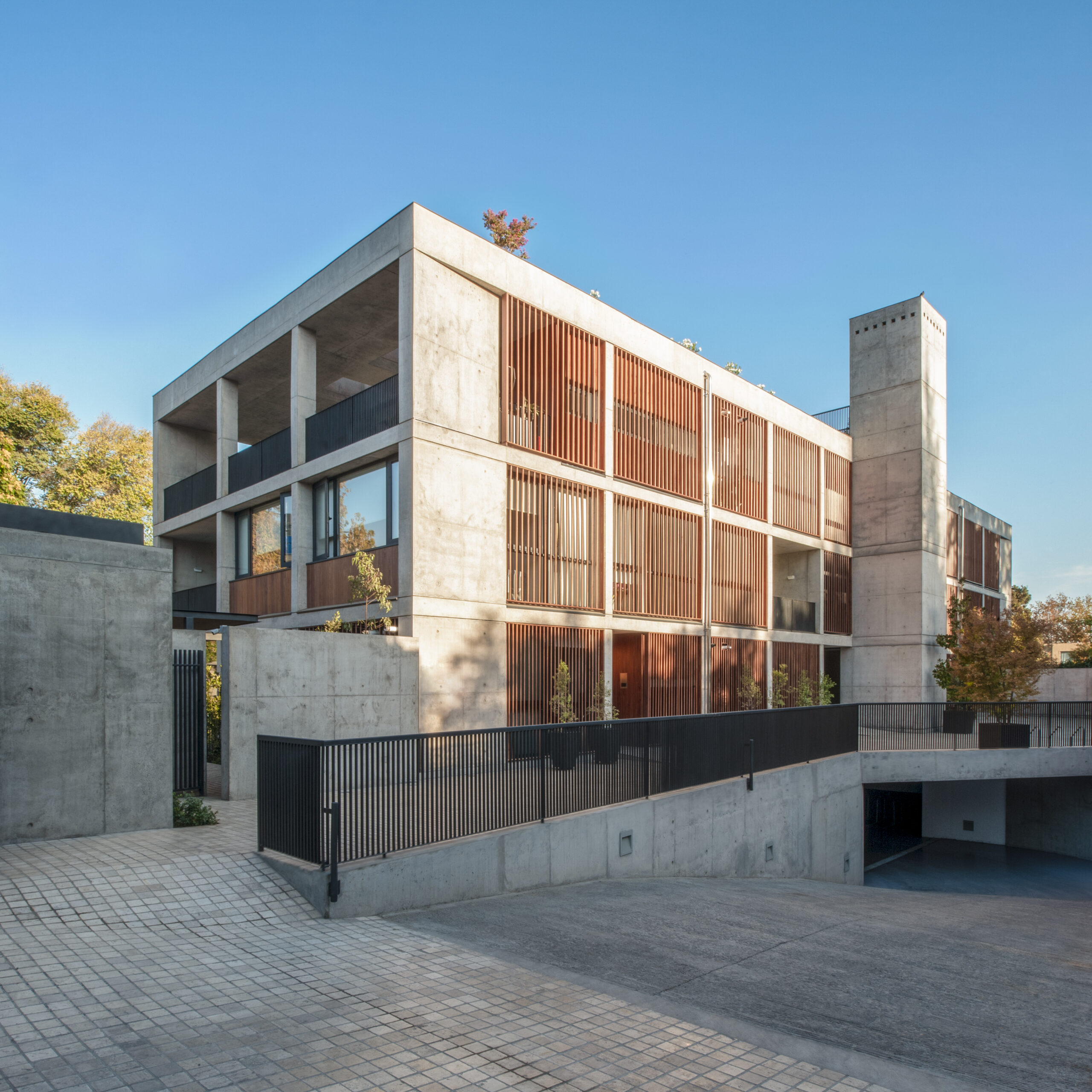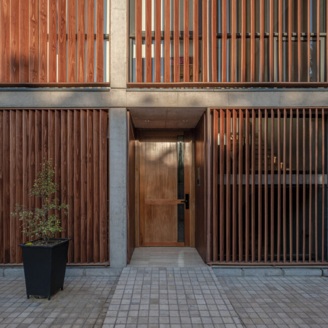 El encargo consistió en desarrollar 4 departamentos dúplex en los pisos 1 y 2 y uno más grande en el piso 3. En parte de la cubierta, una terraza privada.  En el resto de la superficie de la cubierta, un techo jardín que se suma a las áreas verdes del vecindario. Este programa introduce una complejidad especial al proyecto, al ser todos los pisos diferentes, debiendo hacer calzar la estructura y las instalaciones que no se superponen en forma natural. Dentro de las primeras decisiones de proyecto estuvo usar el mínimo de elementos y materiales que fuera posible; hormigón visto para elementos estructurales, aluminio oscuro y cristal para las ventanas, madera para celosías y tabiques. El volumen principal rectangular, se compone de 4 fachadas diferenciadas según su emplazamiento y orientación.  En los espacios de circulaciones comunes interiores, se usó la misma materialidad de las fachadas. Los recintos interiores de los departamentos tienen un mínimo de revestimientos diferentes.  Los pisos son de madera y los muros y cielos son pintados de color claro para conseguir ambientes luminosos, livianos y despejados.