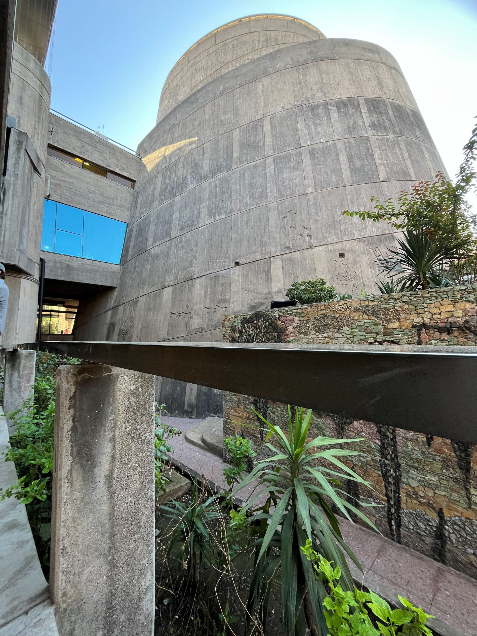 Imponente y construido en hormigón, fue proyectado para dialogar con el cerro Manquehue y el río Mapocho, en un terreno de cinco hectáreas. Fue concebido como un conjunto único: un anillo cuadrado elevado sobre un zócalo que encierra un patio interior donde se disponen el núcleo central y el “caracol”, los que están conectados por puentes.